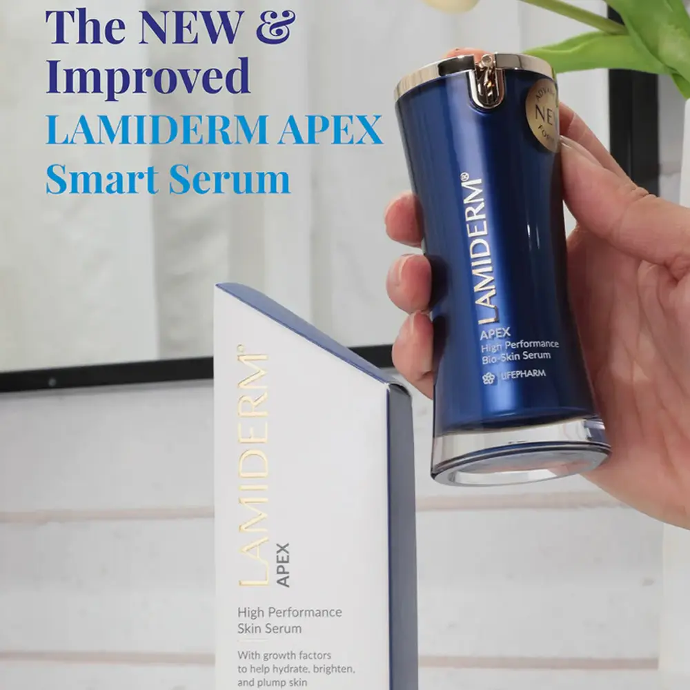 Lamiderm APEX este cel mai eficient răspuns pentru a preveni și a încetini semnele îmbătrânirii. Este primul ser 100% natural pentru regenerarea celulelor pielii. Este o formulă unică pe piață, deoarece, datorită compoziției sale speciale, stimulează producerea tuturor celor trei fibre fundamentale ale pielii: colagen, elastină și fibronectină, spre deosebire de alte produse care sunt capabile să stimuleze producția unuia sau două dintre aceste elemente.
